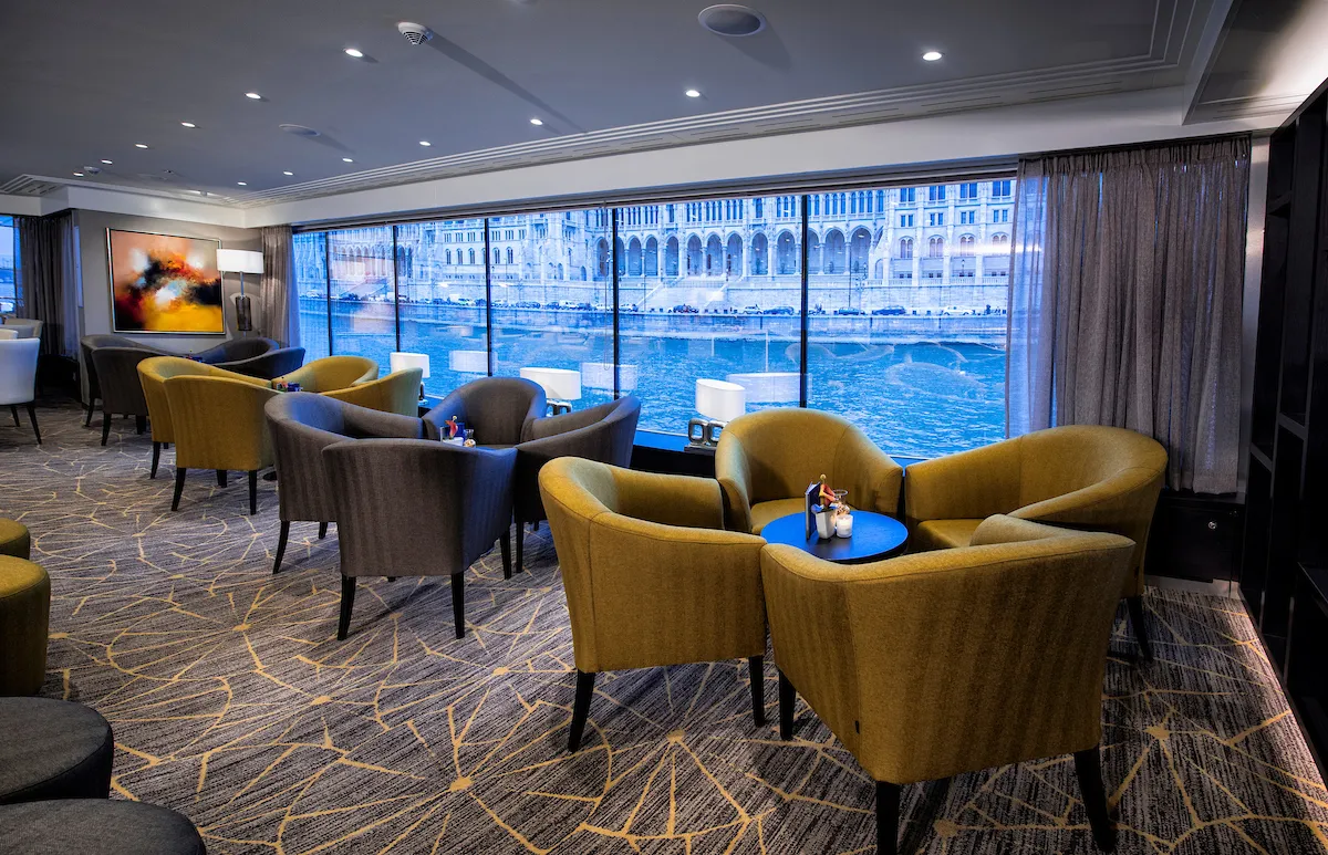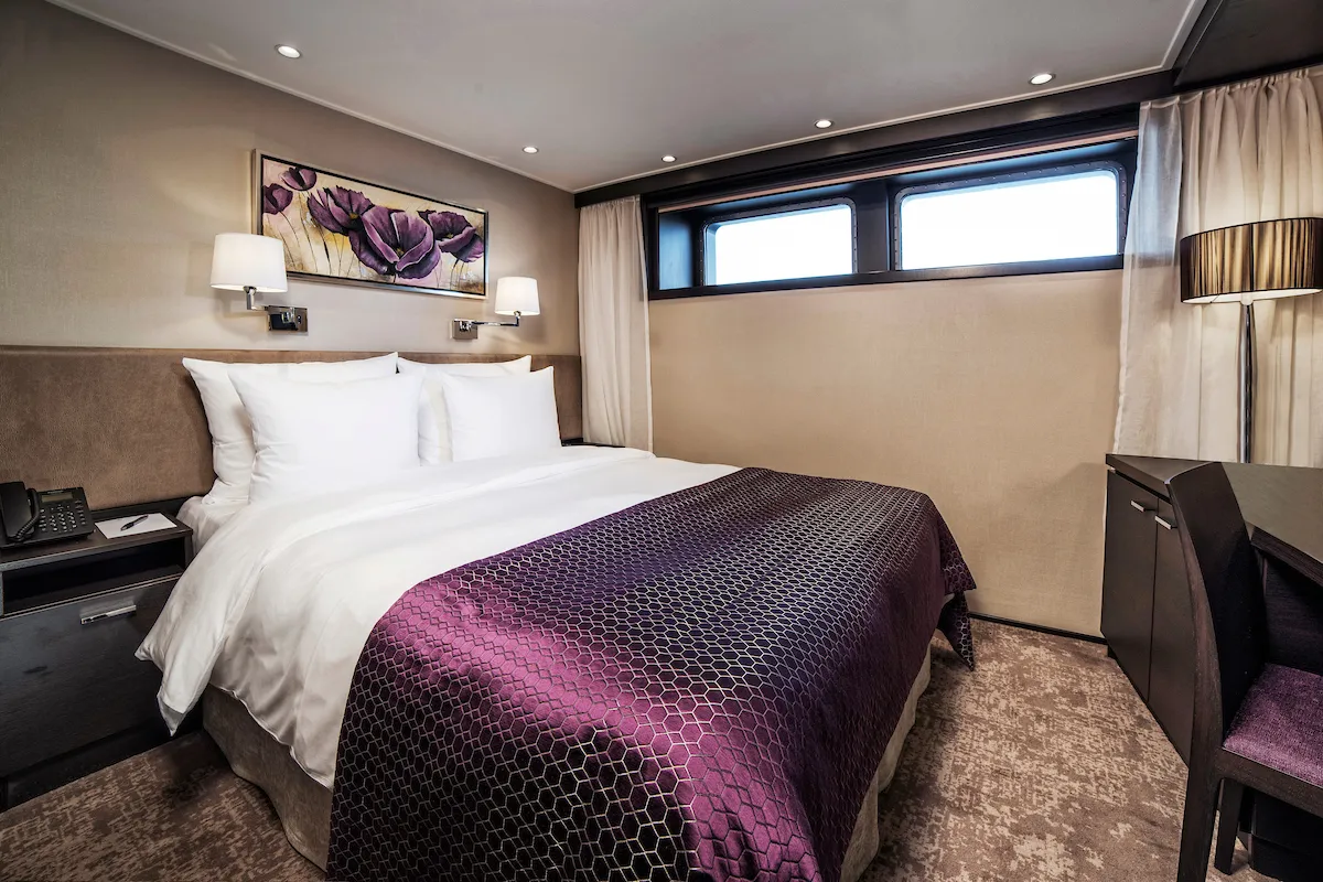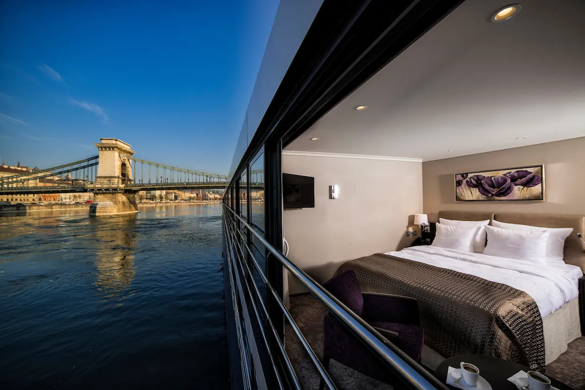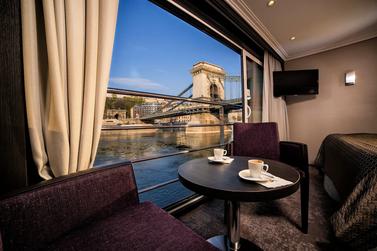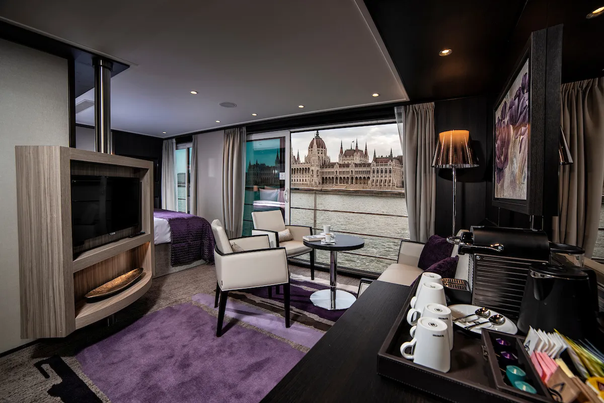 The most distinguishing feature of the ship is its Panorama Suites, which make up the majority of the accommodation options. These suites are known for their floor-to-ceiling, wall-to-wall windows that open to create a French balcony, offering uninterrupted views of the surrounding landscape. The 200-square-foot rooms feature comfortable beds that face the windows, so passengers can enjoy a full view of Europe’s scenic rivers and rolling landscapes from the comfort of their own space.