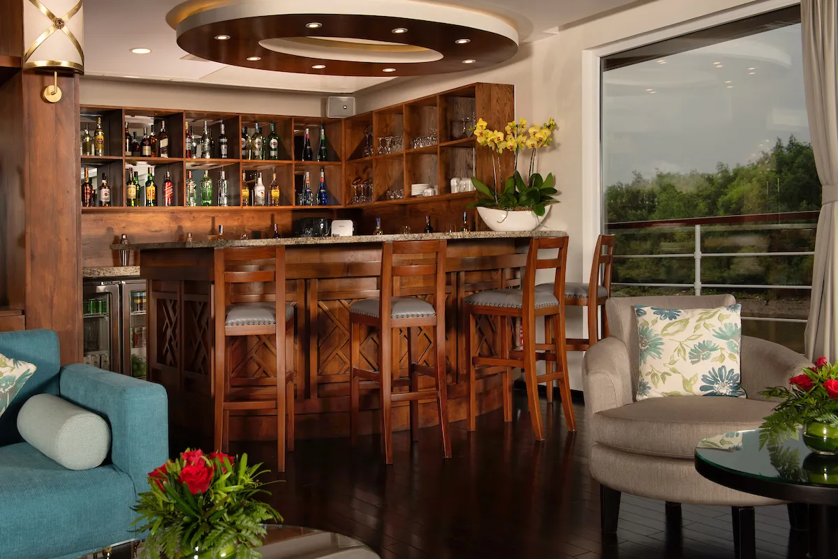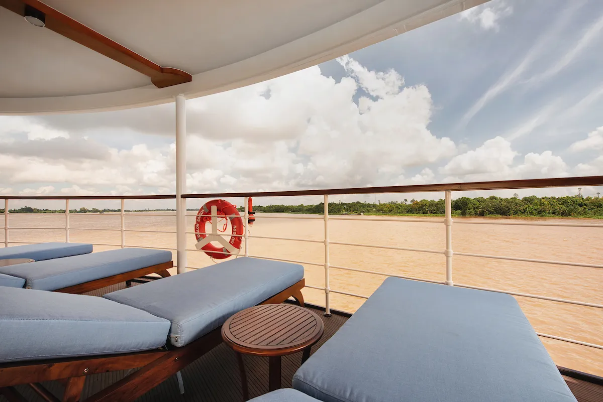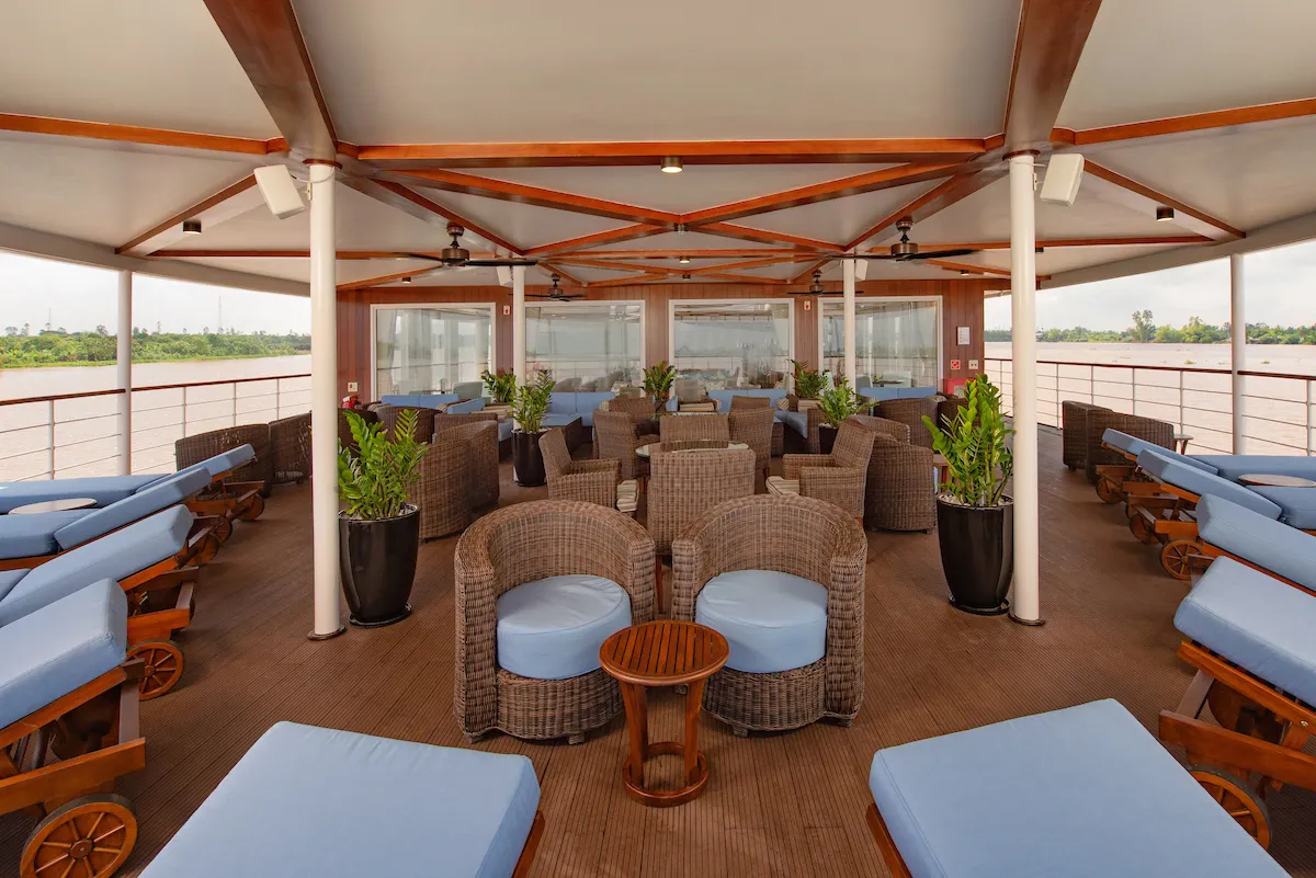 The public areas of the ship are equally inviting, from the spacious sun deck to the cozy lounge where passengers can enjoy a cocktail or read a book while the river drifts by. The onboard dining experience is also exceptional, blending local flavors with international cuisine. Passengers can enjoy fresh, seasonal produce and regional dishes like Cambodian amok or Vietnamese pho, while also having access to classic Western fare.