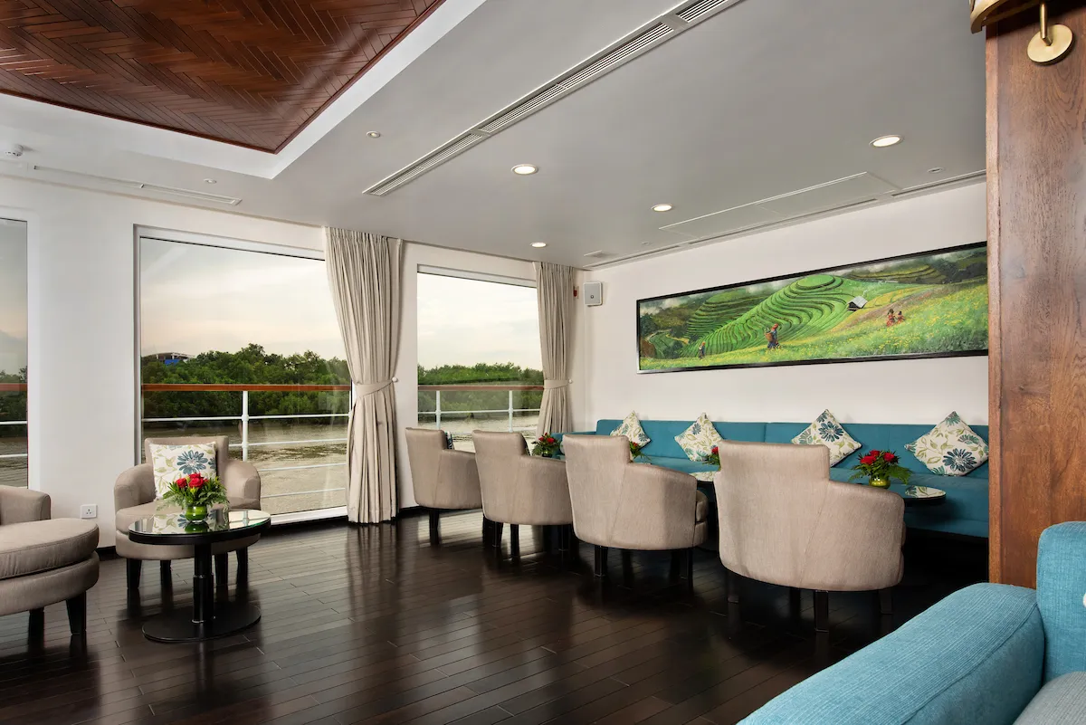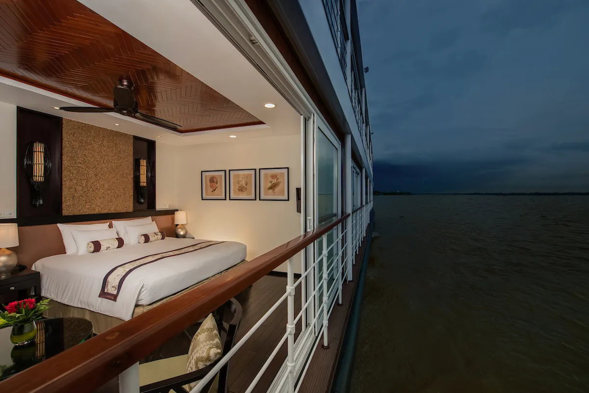 Each suite is designed with floor-to-ceiling panoramic windows, which transform the room into an open-air balcony, providing stunning views of the Mekong’s scenic landscapes. The rooms are thoughtfully decorated with contemporary Asian-inspired touches, and the private bathrooms and comfortable beds offer a relaxing respite after long days of exploring.