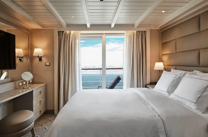 The Silversea Cloud offers an exclusive experience with a capacity of only 200 guests (reduced to 254 in non-polar regions), allowing for a high crew-to-guest ratio that ensures personalized service. The ship’s spacious suites, all with ocean views, are a hallmark of Silversea’s dedication to luxury. Each suite is equipped with a personal butler, high-end amenities, and a private veranda, allowing guests to soak in the stunning vistas of their surroundings.